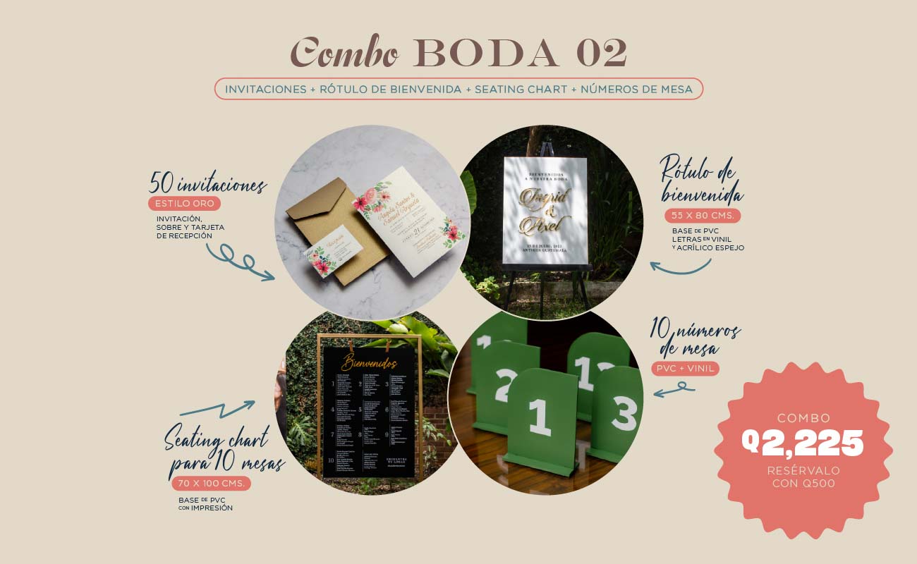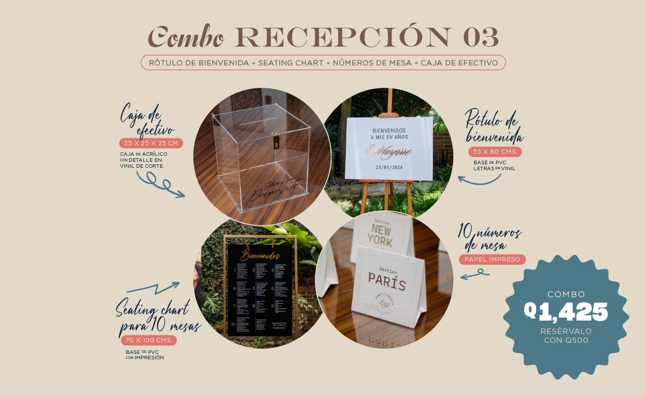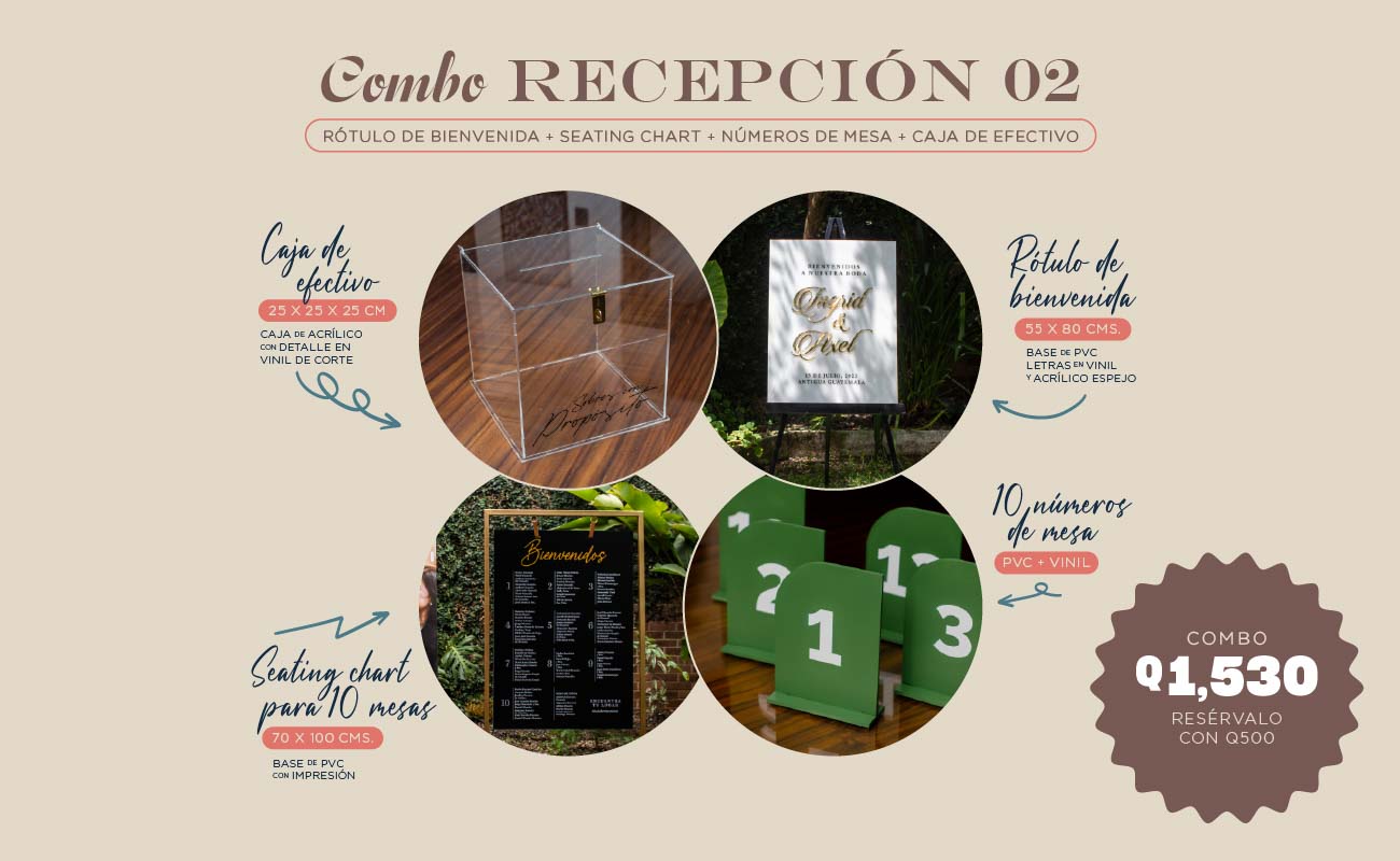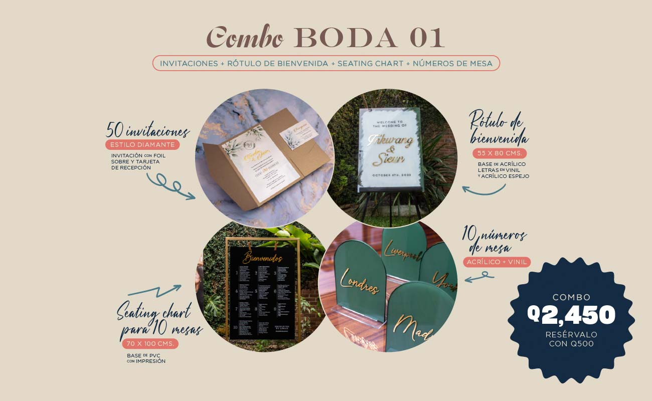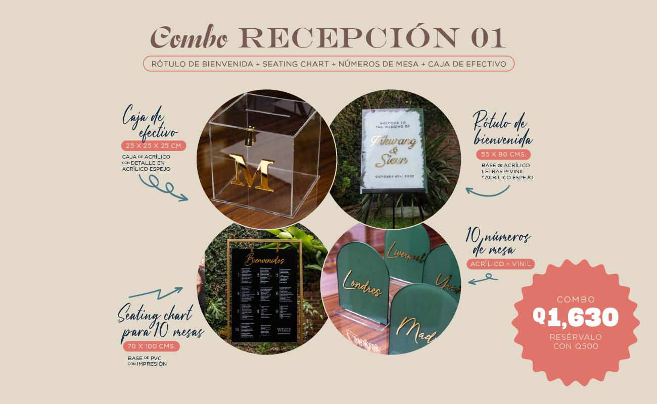 No solo hacemos invitaciones para boda en Guatemala: descubre nuestro catálogo completo de rótulos de acrílico, cajas para regalos, números de mesa y tarjetas de agradecimiento, todo con diseños personalizados para tu día especial.
