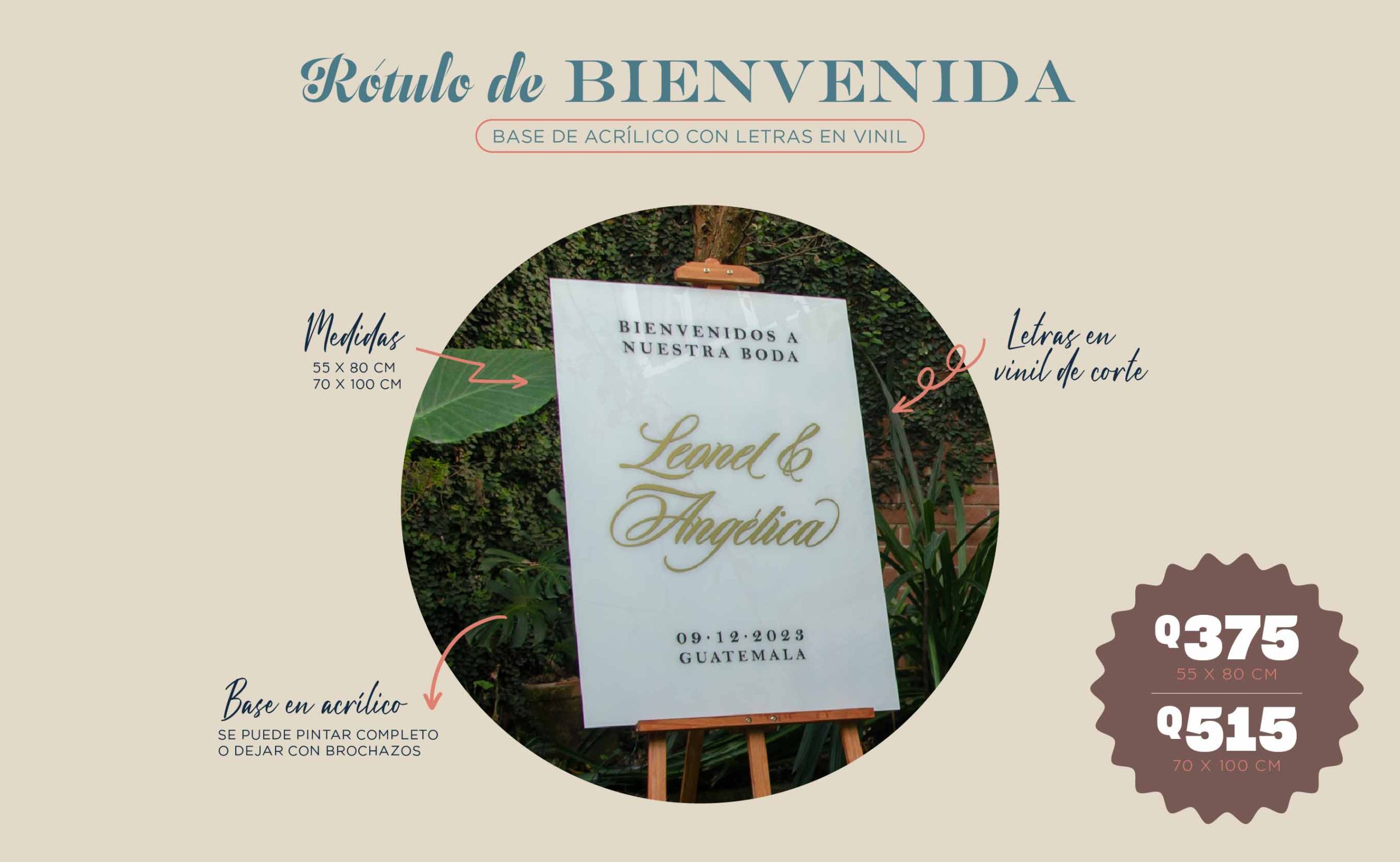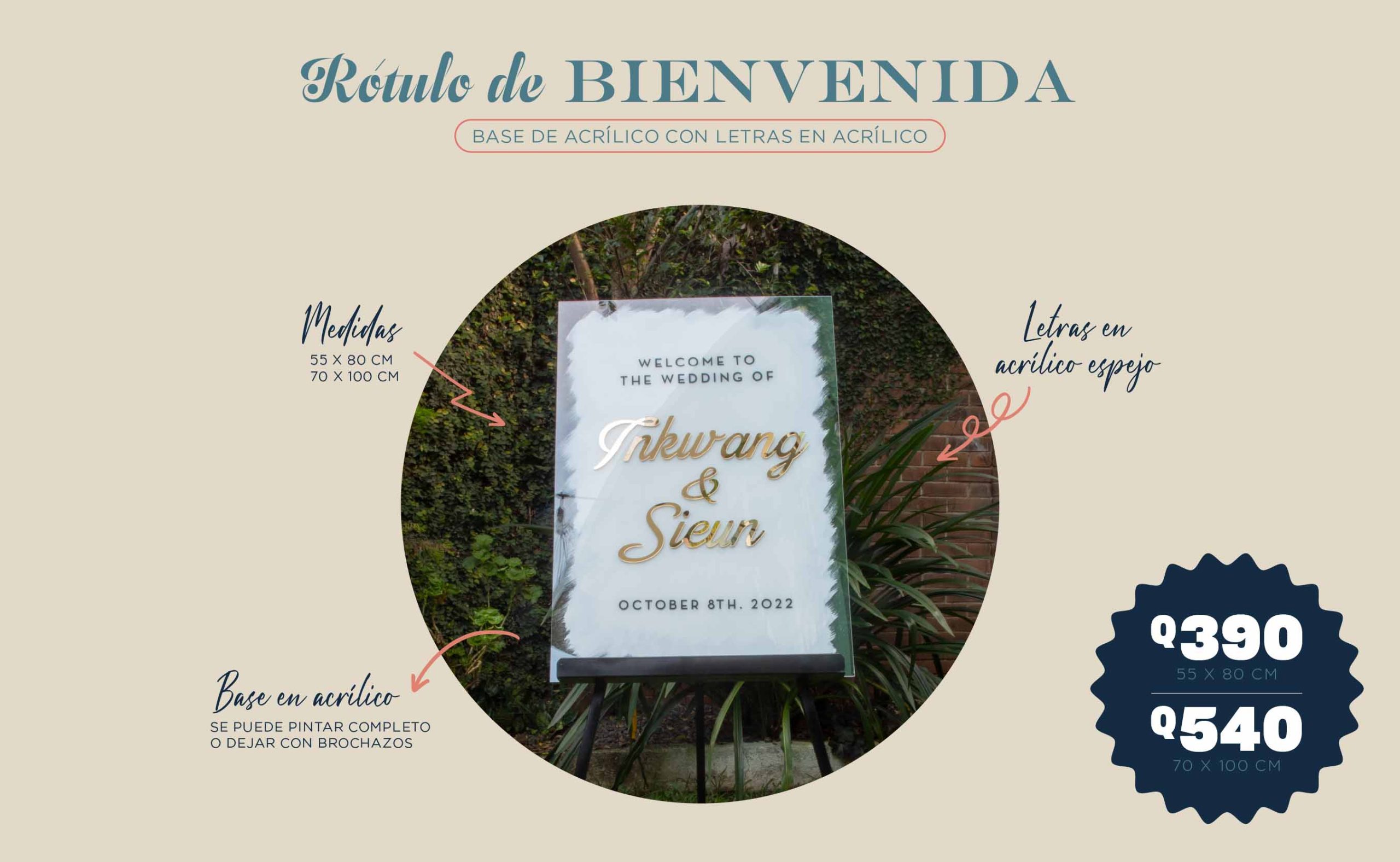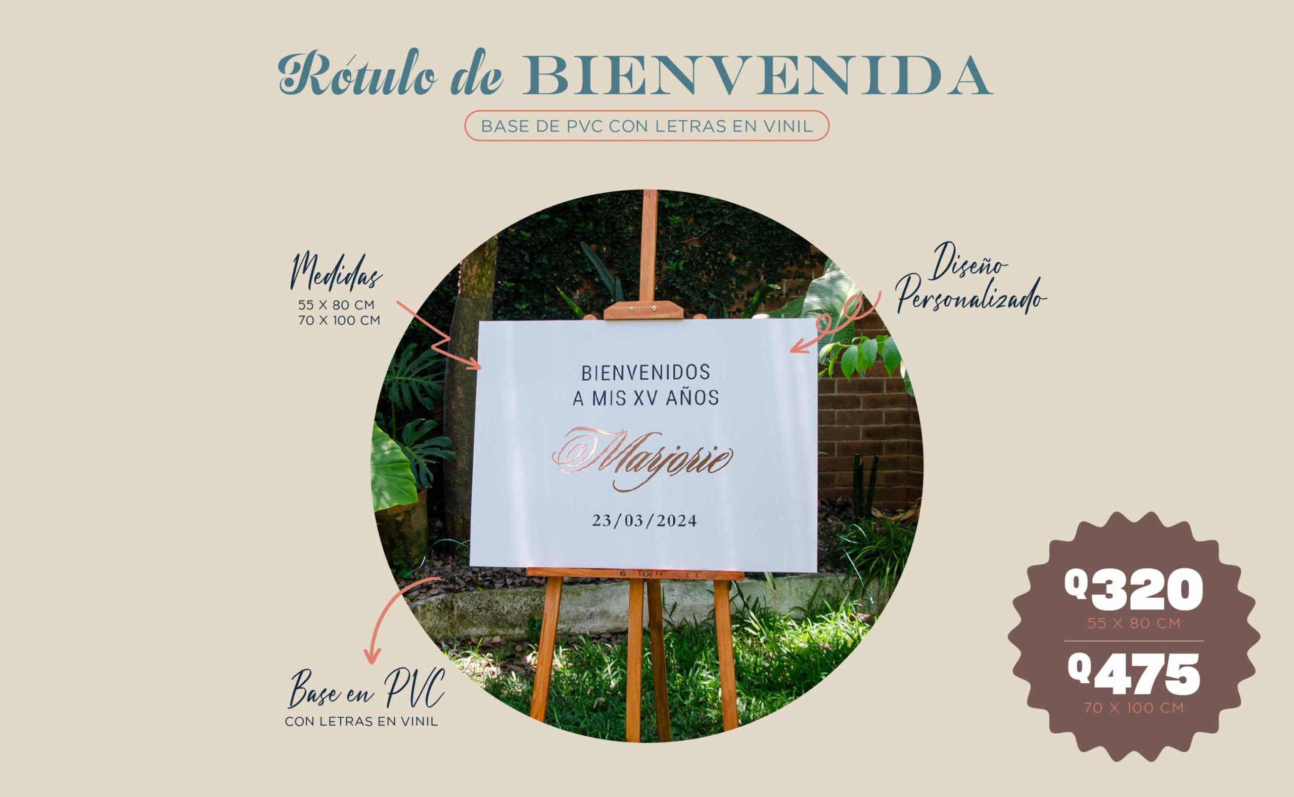 Desde rótulos de bienvenida en acrílico, pvc y tela, nuestros materiales de alta calidad garantizan que cada elemento sea impecable. Con nuestro equipo creativo, podrás personalizar: