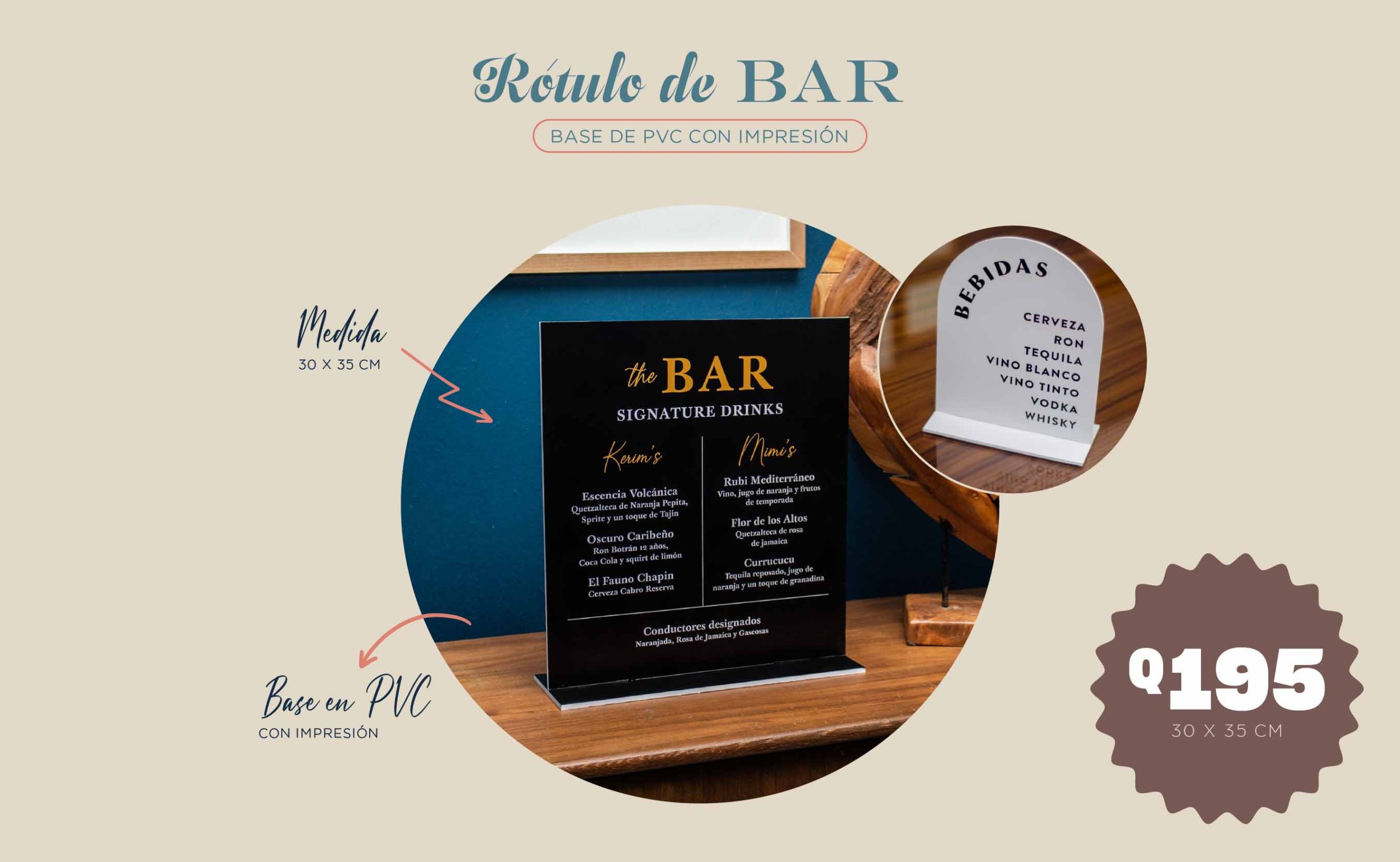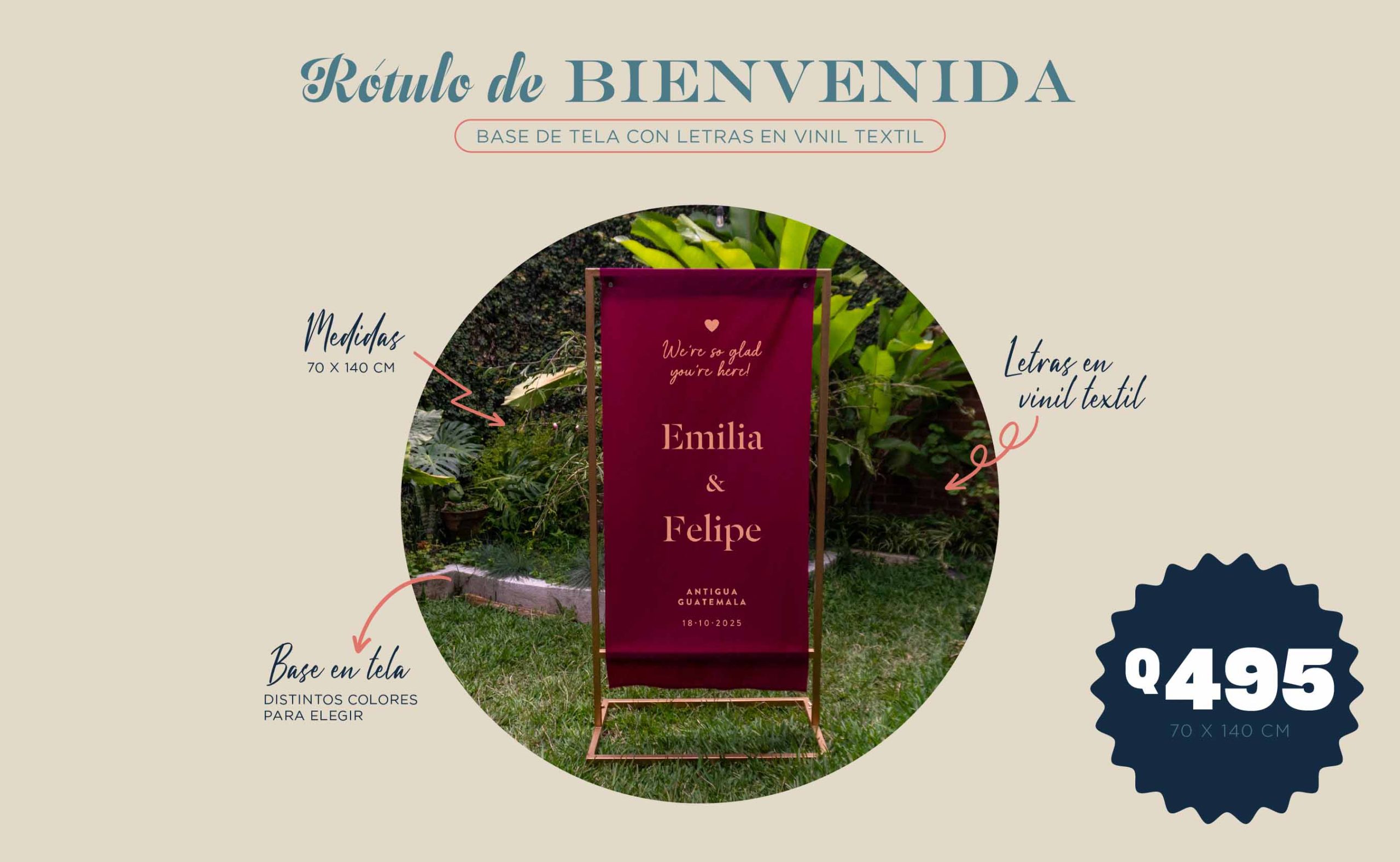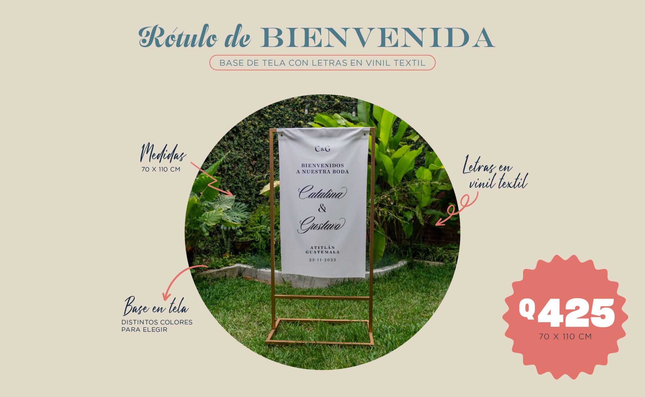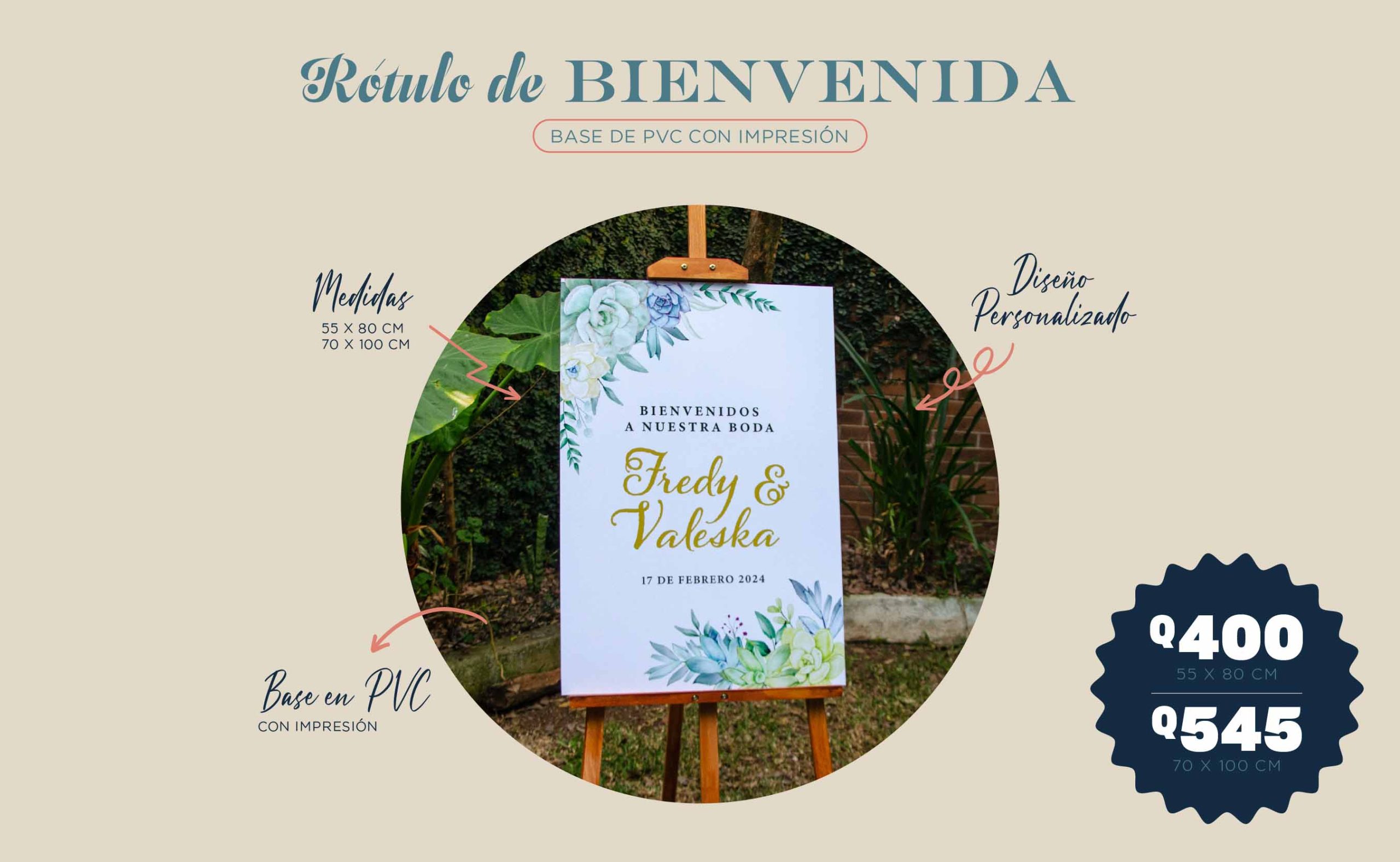 Desde rótulos de bienvenida en acrílico, pvc y tela, nuestros materiales de alta calidad garantizan que cada elemento sea impecable. Con nuestro equipo creativo, podrás personalizar: