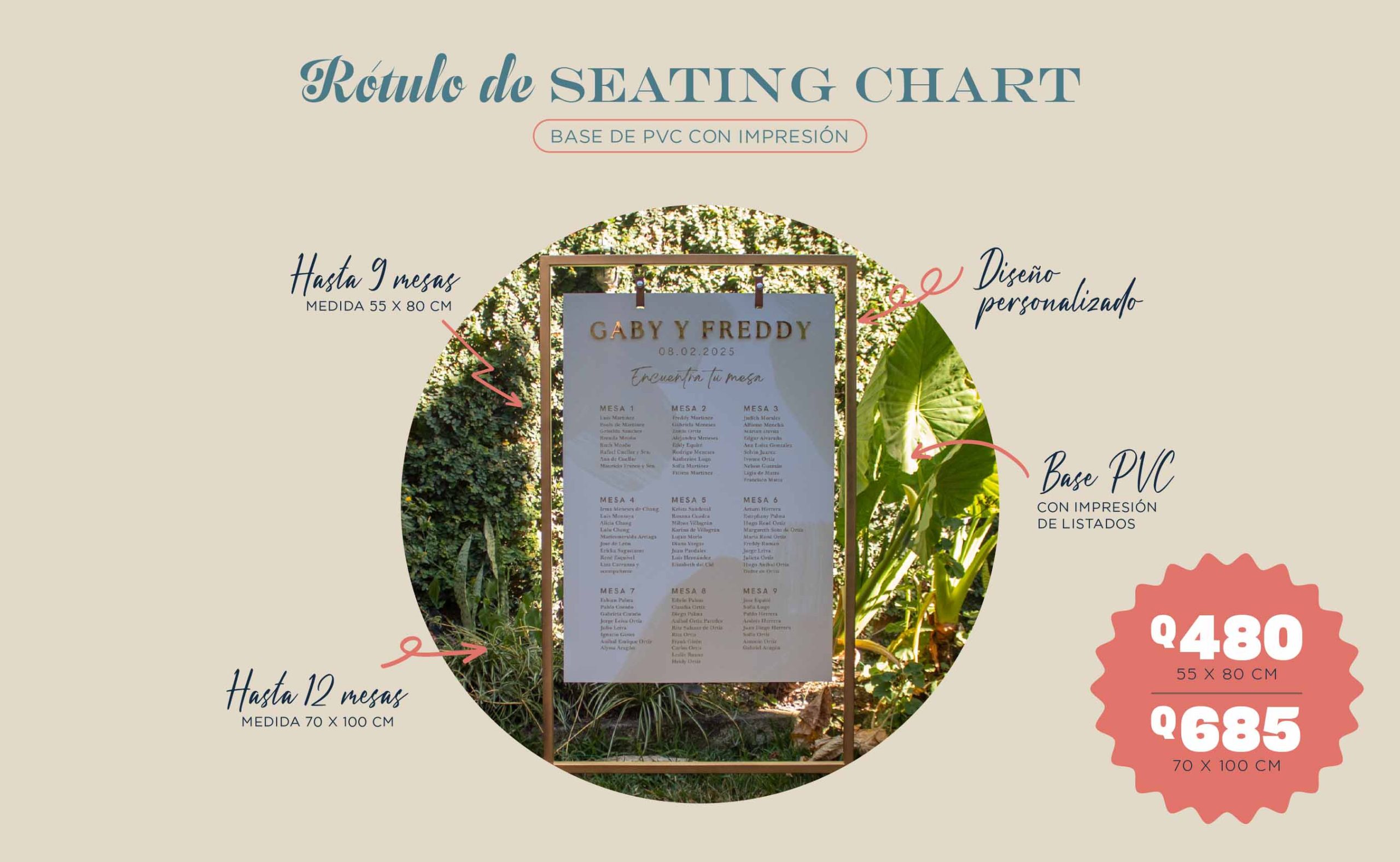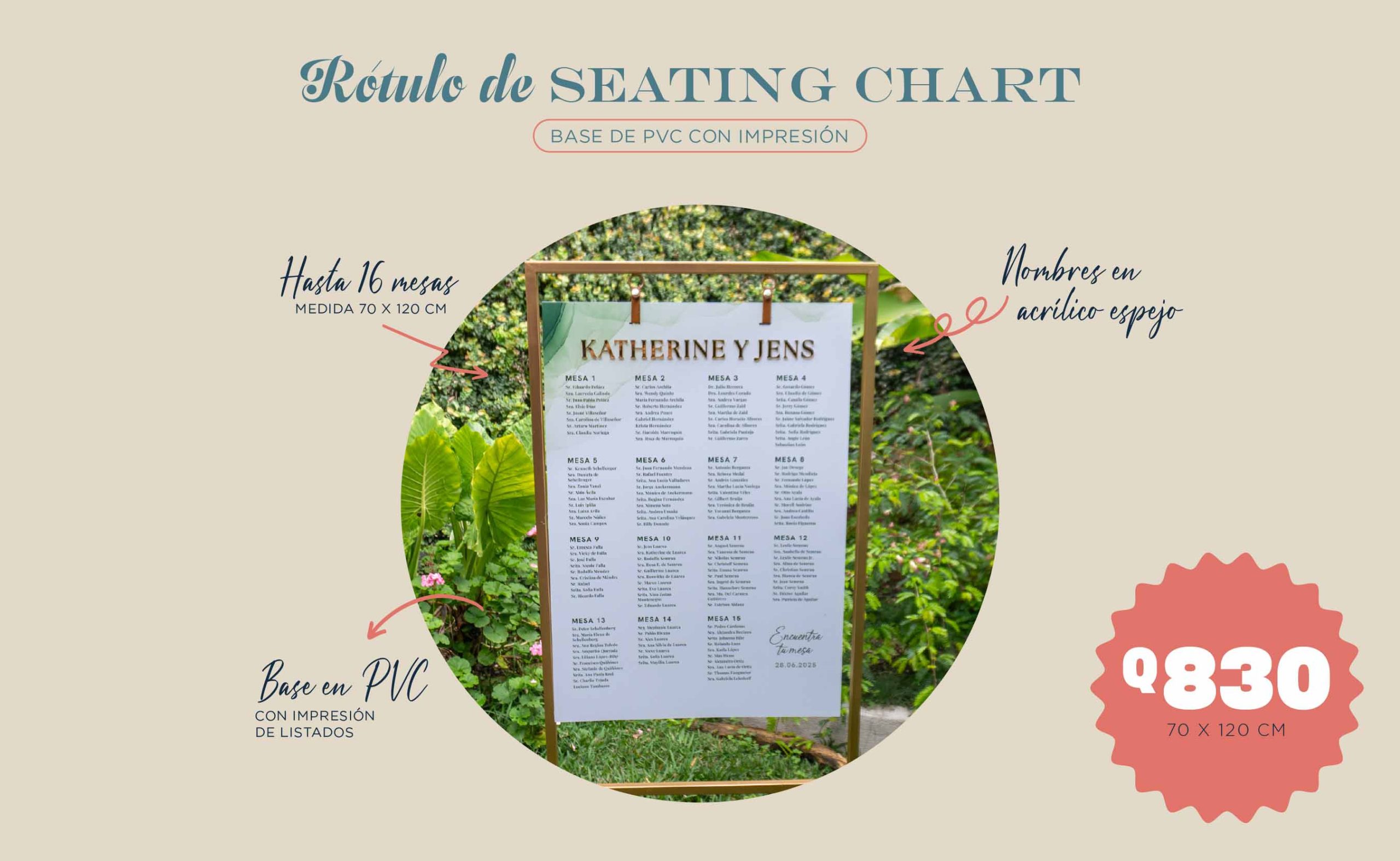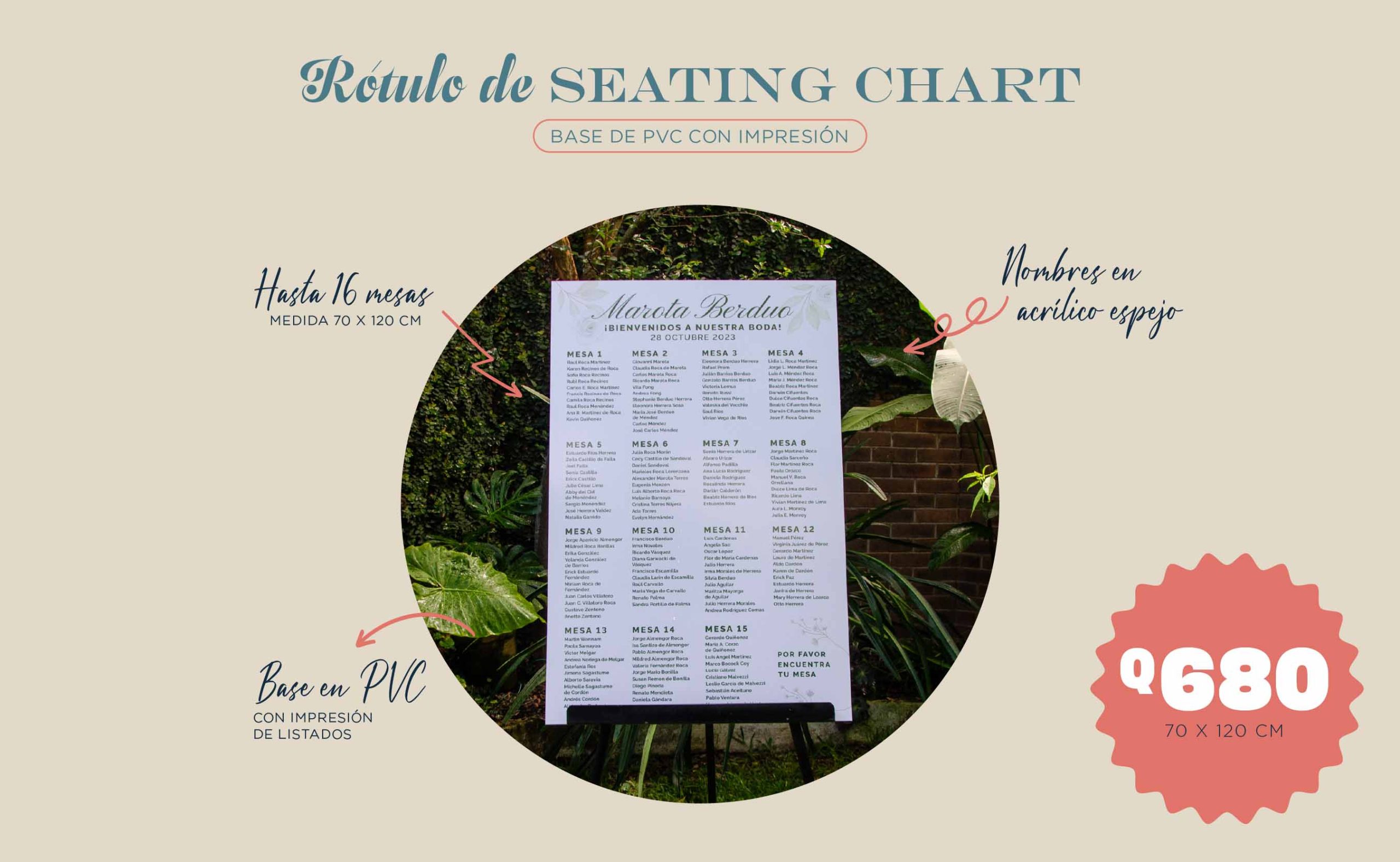 Gracias a la calidad de nuestros materiales y la dedicación de nuestro equipo, te garantizamos un seating chart duradero, personalizado y diseñado para que cada persona encuentre su lugar de manera sencilla y con un toque especial.